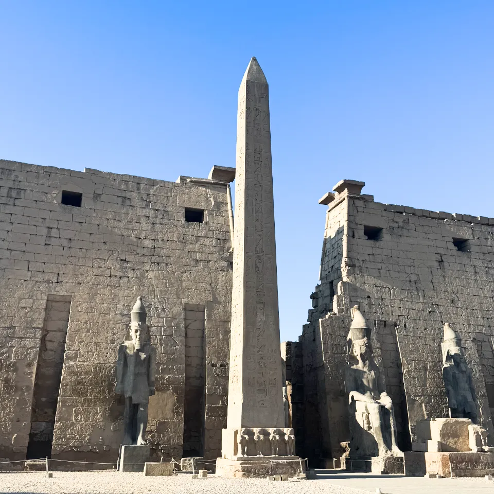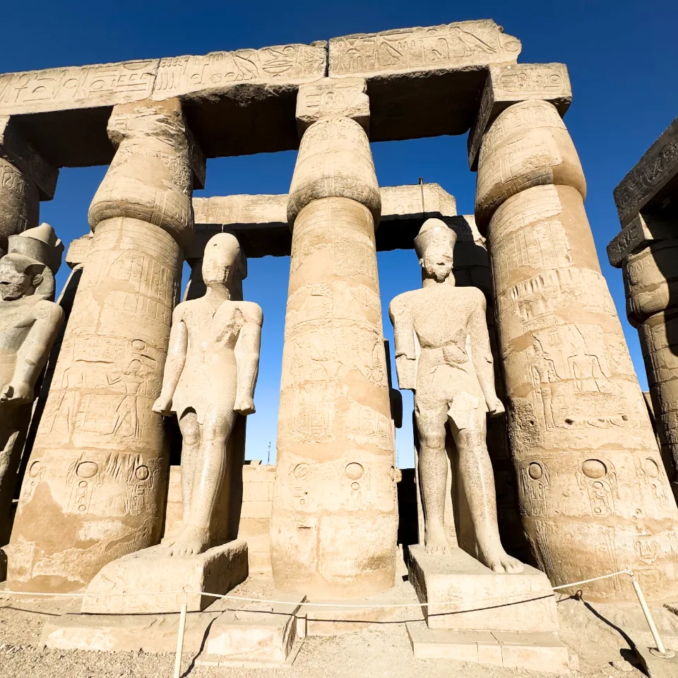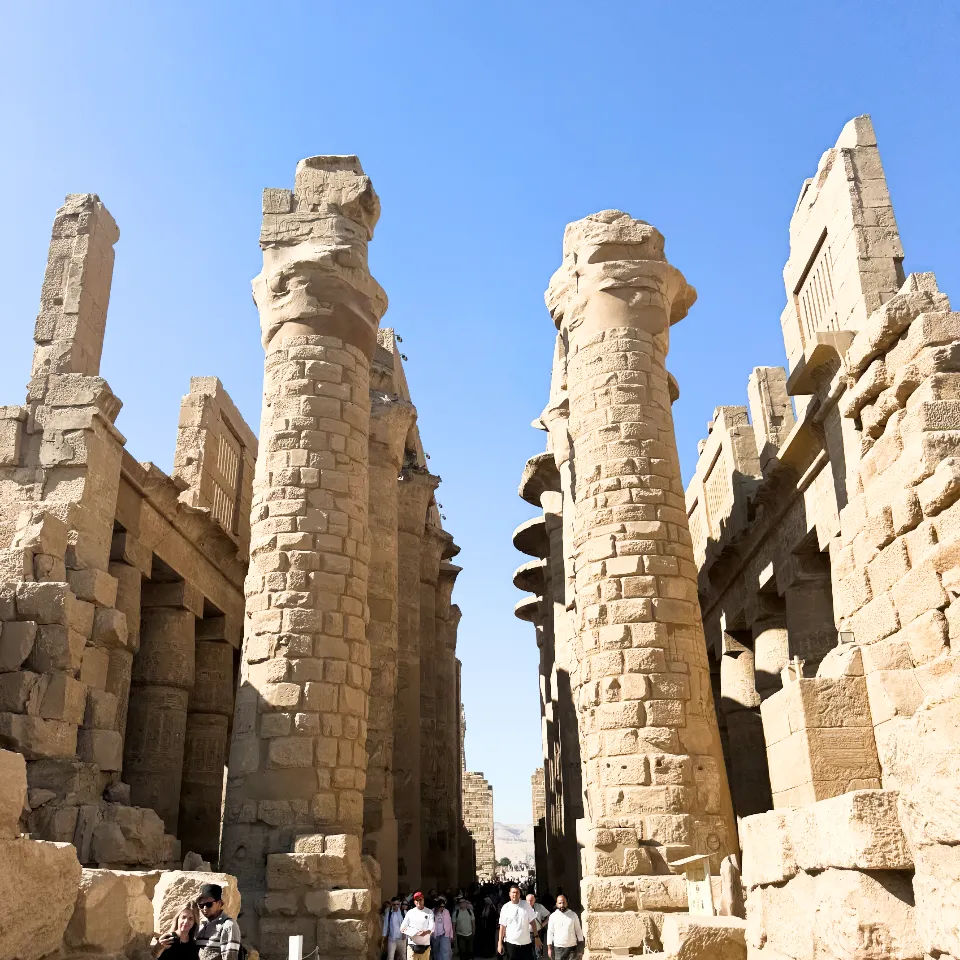 Temples de Louxor et de Karnak reliés par l’avenue des Sphinx que nous emprunterons. Le temple de Karnak héberge le grand temple d’Amon, d’autres petits temples et sanctuaires, ainsi que le grand lac sacré. Temple solaire orienté au solstice d’hiver.